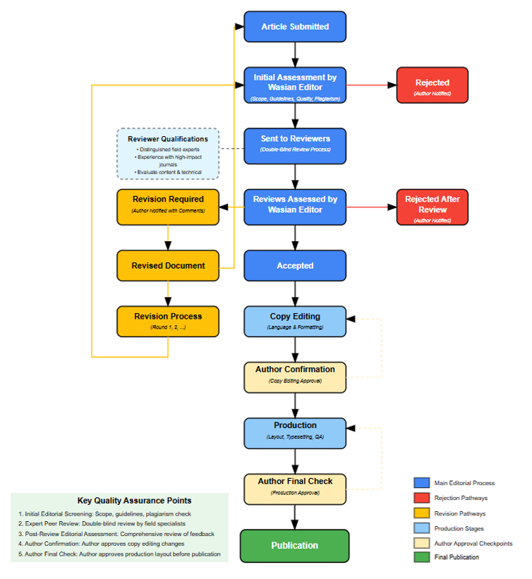 The Wasian journal implements a comprehensive peer review workflow that ensures quality and rigor in published research. The process begins when an author submits a manuscript and follows these key stages (see the image below):