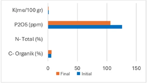 The graphs from the initial and final soil analyses show a decrease in potassium (K) content, with a difference of 0.22 me/100g. According to Herawati (2015), potassium ions are highly mobile and are easily lost from the soil through leaching. This occurs because potassium is not strongly retained by the soil surface (District et al., 2020).