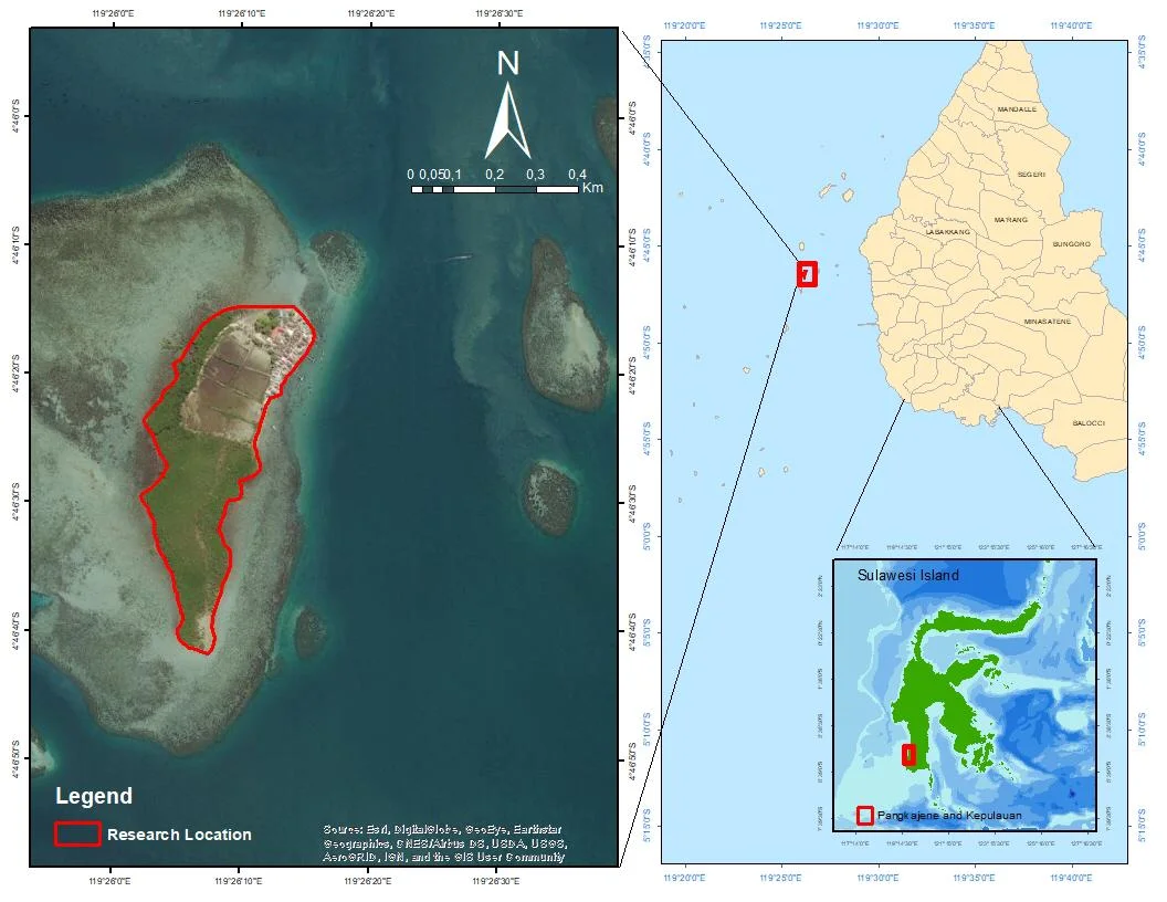 This study conducted in Bangko-bangkoang Island, Mattiro Uleng Village, Pangkajene Islands Regency, South Sulawesi (Figure 1).