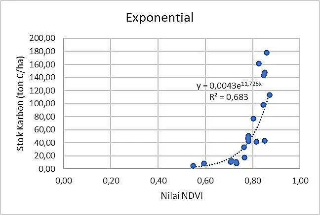 The carbon stock estimation model was generated by analyzing NDVI value and carbon stock data from field survey through a regression model analysis was conducted using Microsoft Excel. This model was developed using a regression model between variable X (vegetation index value) and variable Y (carbon value). The regression analysis results presented in Figure 3 show an exponential relationship between the Normalized Difference Vegetation Index (NDVI) value and biomass. The regression model obtained is y = 0.0043e(11.726x) with R² = 0.683. This R² value indicates that NDVI is able to explain of the variation in biomass, with the remainder being influenced by other factors such as vegetation type, stand age, canopy density, and local environmental conditions.