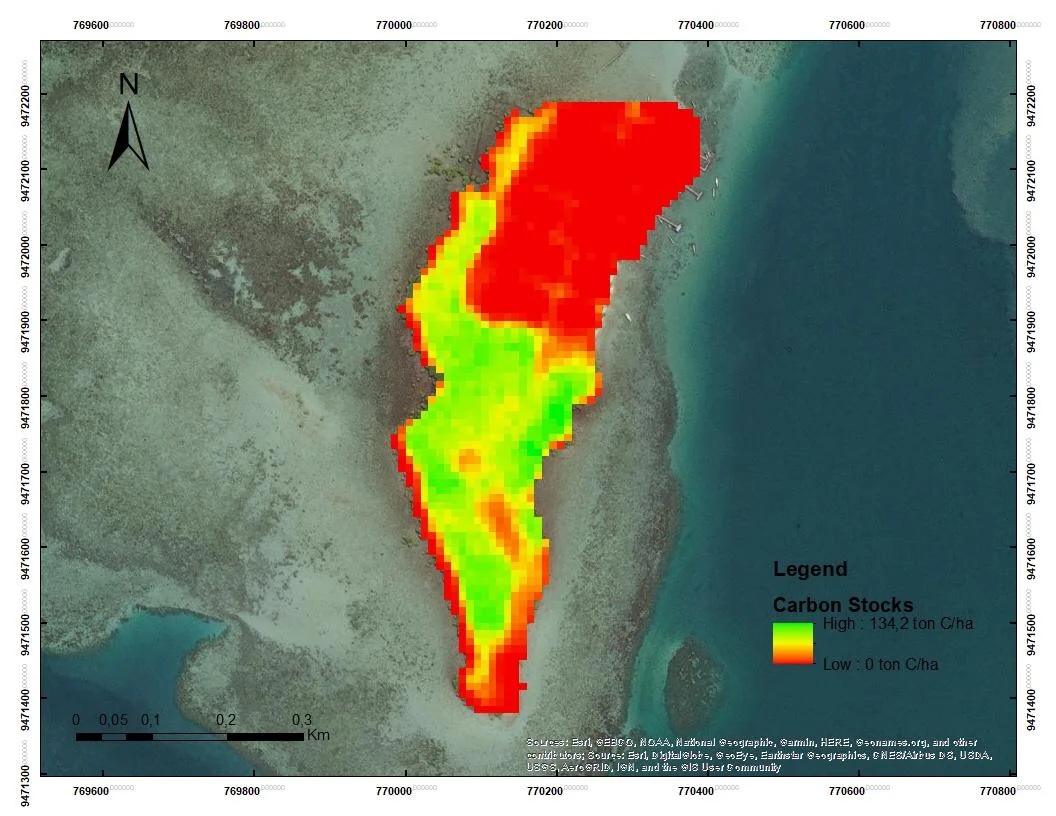 Comparison with previous studies conducted by (Khan et al., 2020) shows a similar approach in using NDVI for vegetation density estimation; however, they used a different allometric model or more limited field data. Their study confirmed that NDVI can be used as a variable to predict carbon stocks in mangrove ecosystems, although it focused more on broader areas without considering species variability. Otherwise, this study integrate carbon calculations based on specific mangrove species, offering a deeper insight into the contribution of each species to the overall carbon stock.